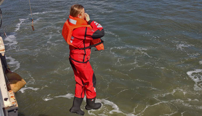 - Aantrekken en gebruik van een overlevingspak en reddingsvest en het toepassen van de persoonlijke- en groepsoverlevingstechnieken in overleven op zee.